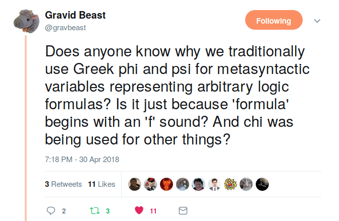 Yesterday, @gravbeast asked on Twitter, Does anyone know why we traditionally use Greek phi and psi for metasyntactic variables representing arbitrary logic formulas? Is it just because 'formula' begins with an 'f' sound? And chi was being used for other things? Although Whitehead and Russell already used φ and ψ for propositional functions, the convention … Continue reading Why φ?